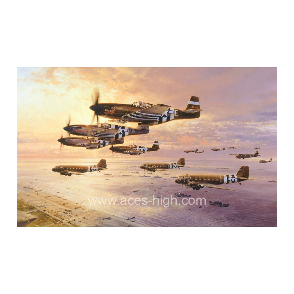 Robert Taylor’s iconic masterpiece D-Day - The Airborne Assault has been hailed by many leading veterans as the most realistic portrayal of D-Day air events rendered by any artist. Seen crossing a section of the invasion beaches, and closely escorted by P-51Bs of the 354th Fighter Group, C-47s of the 438th TCG tow CG-4 Waco gliders bringing in yet more reinforcements for the 82nd Airborne Division.